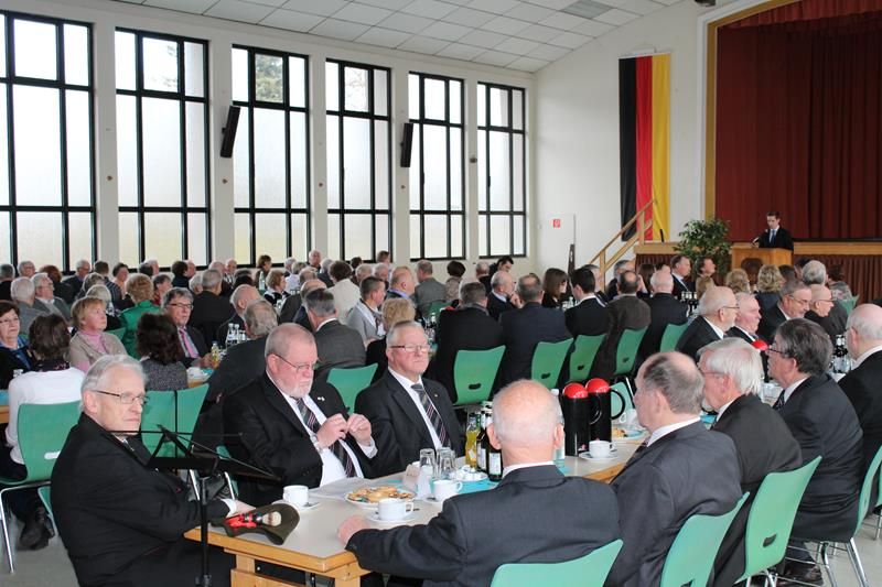 Hierauf folgte eines der Hauptbestandteile des Neujahrsempfanges: Die Festrede. Gehalten wurde sie in diesem Jahr von Bodo Löttgen, Generalsekretär der CDU NRW. Getragen wurde die Rede von informativen Ausführungen zur aktuellen Politik unserer Landesregierung. Mit einigen Vergleichen zum Freistaat Bayern wurde das Missmanagement der nordrhein-westfälischen Regierung den Zuhörern deutlich aufgezeigt. Zu nennen sind hier insbesondere die Gebiete des Breitbandausbaus, der Flüchtlingshilfe und der Instandhaltung unserer Infrastruktur. Aber auch der Festredner konnte die Pegida-Bewegung nicht unerwähnt lassen. So hielt er es für sinnvoll, dass man einmal genauer mit den Leuten redet. Schließlich könne es gut sein, dass diejenigen, die dort marschieren schlicht Zukunftsängste haben, politikverdrossen und anderweitig enttäuscht sind. Es sei Aufgabe der Politik, die Menschen zu führen und ihnen das Gefühl zu geben, gut geführt zu werden. Löttgen führt weiter aus, dass die Menschen kein großes Interesse daran hätten, ständig durch Volksabstimmungen mitzuentscheiden. Vielmehr gingen sie zur Wahl, damit die Politiker diese Dinge für Sie erledigten und verständlich machten.