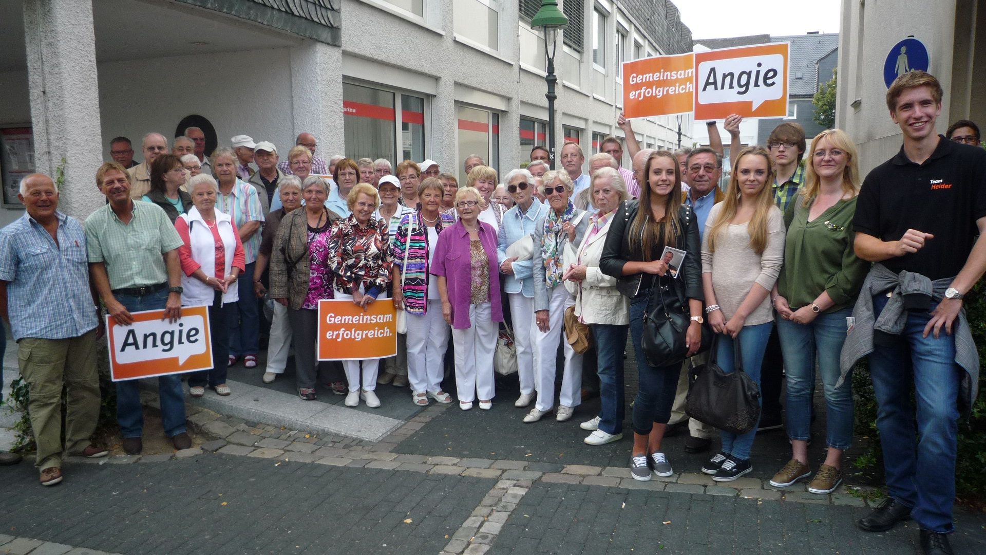 Unter dem bunt gemischten Publikum befanden sich ebenfalls ca. 53 Herscheider CDU- / Sen-Mitglieder, die sich mit einem eigens gemieteten Bus in den Nachbarkreis aufmachten. Dass die Bundeskanzlerin und nicht irgendwer kam, merkte man schnell an den erheblichen Sicherheitsvorkehrungen. Zwar konnte sich jeder im Umfeld des Marktplatzes einfinden, doch war es nur wenigen Leuten, die sich schon weit im Vorfeld der Veranstaltung angemeldet hatten, vorbehalten, die Vorzüge der Sitzplätze im Sicherheitsbereich direkt vor der Bühne zu genießen. Der Dank geht an dieser Stelle an den Vorsitzenden der Senioren Union Herscheid, Wolfgang Weyland, der sich in gewohnt engagierter Manier dafür eingesetzt hat, dass möglichst viele der mitgereisten Herscheider einen Sitzplatz bekommen haben.