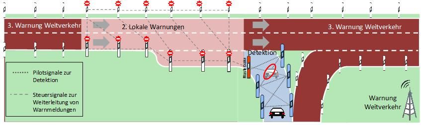 Kern des Warnsystems ist ein Funkfeld, das zwischen sechs Leitbaken aufgebaut wird und durchfahrende Fahrzeuge an Autobahnauf- und abfahrten registriert. Die durch Solarstrom betriebene Mess- und Kommunikationstechnik erkennt, ob ein Fahrer in der falschen Richtung auf die Autobahn auffährt. Nimmt das System einen Falschfahrer wahr, wird dieser nicht nur mittels Signal-Blinkern darauf hingewiesen, sondern innerhalb von wenigen Sekunden wird auch eine komplexe Informationstechnik in Gang gesetzt. Zum einen werden Polizei und Verkehrswacht benachrichtigt. Zum anderen besteht die Möglichkeit, alle Fahrzeugführer auf der betreffenden Autobahn mittels einer Handy-App zu warnen.