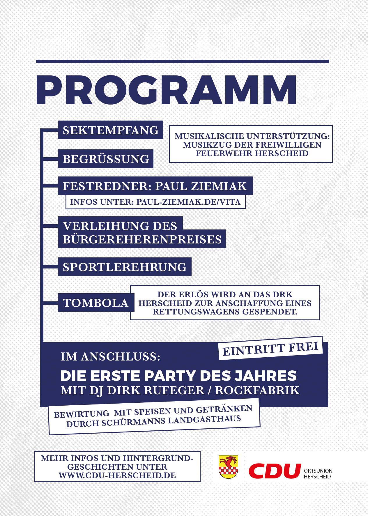 Der Neujahrsempfang 2016 wartet mit einigen Neuerungen auf. Nach der Rede von Paul Ziemiak (Bundesvorsitzender der Jungen Union Deutschland) und den Ehrungen wird es mit einer Tombola und der ersten Party des Jahres bei professioneller Bewirtung und Musik weitergehen. Es sind alle interessierten Bürger herzlich eingeladen.