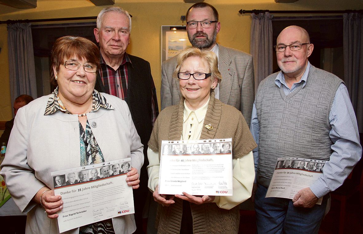 Platzkonzert, Bayernabend, Neujahrsempfang, Ferienspaß _ bei all diesen Veranstaltungen hat Gisela Weyland stets geholfen. Sie wurde für 40-jährige Mitgliedschaft geehrt. 35 Jahre lang hält Bernd Raulf der CDU die Stange, er leistete ihr unter anderem als Hausmeister der Schützenhalle wichtige Hilfe. Ebenso engagiert ist Eckhard Volkmann, der sich seit 30 Jahren für die CDU einsetzt. Ebenfalls 30 Jahre mit dabei ist Fraktionsvorsitzender Eberhard Kaufmann, ein "Mann mit Ecken und Kanten", wie ihn Sigrid Schröder nannte. Sie selbst ist seit 35 Jahren CDU-Mitglied. "Sigrid ist unsere Powerfrau", lobte Kaufmann die 1. stellvertretende Bürgermeisterin.dg